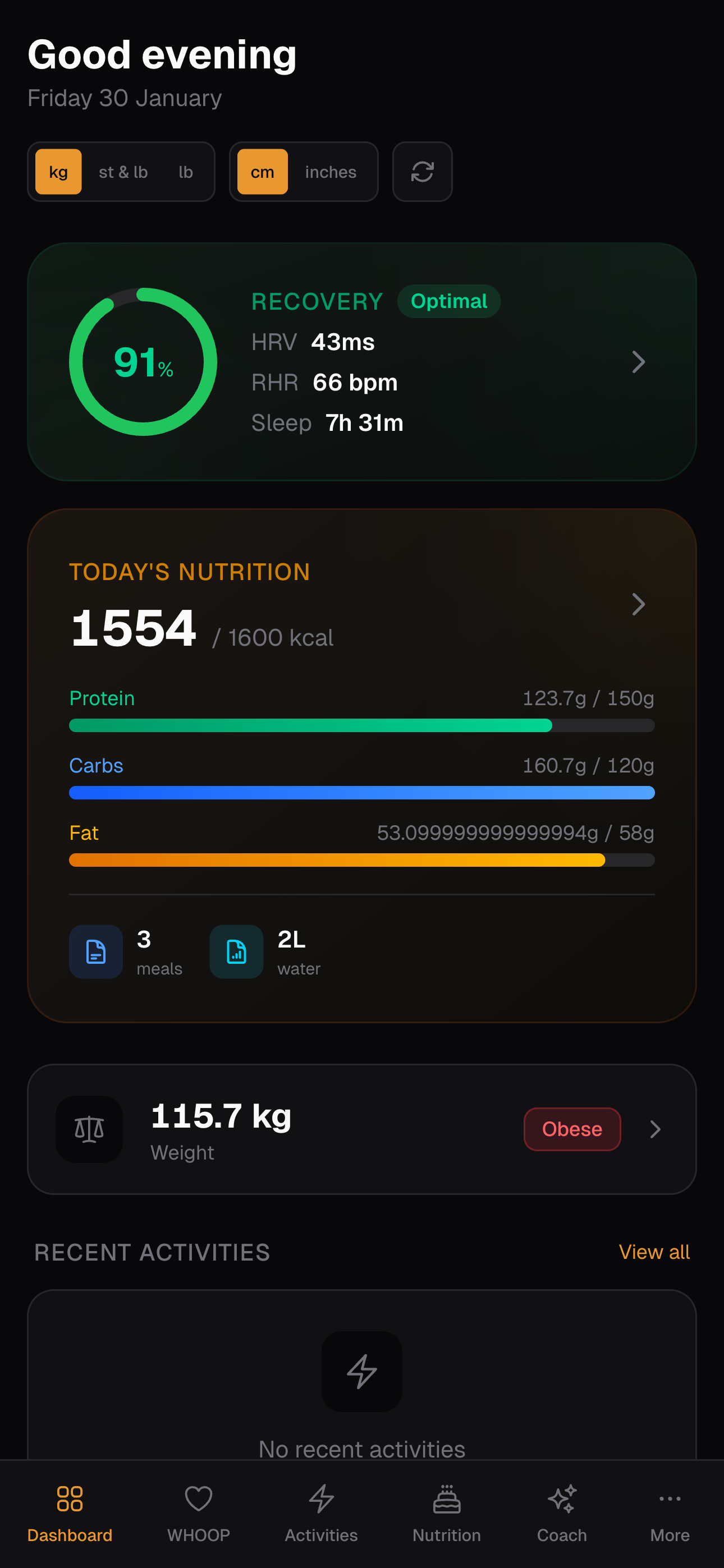 This is my portal. Everything in one place. WHOOP data syncs automatically. Strava activities pull in overnight. I log my weight and nutrition manually because, honestly, that's the only way to get it all in one system without paying for three different premium subscriptions that still won't talk to each other properly.
