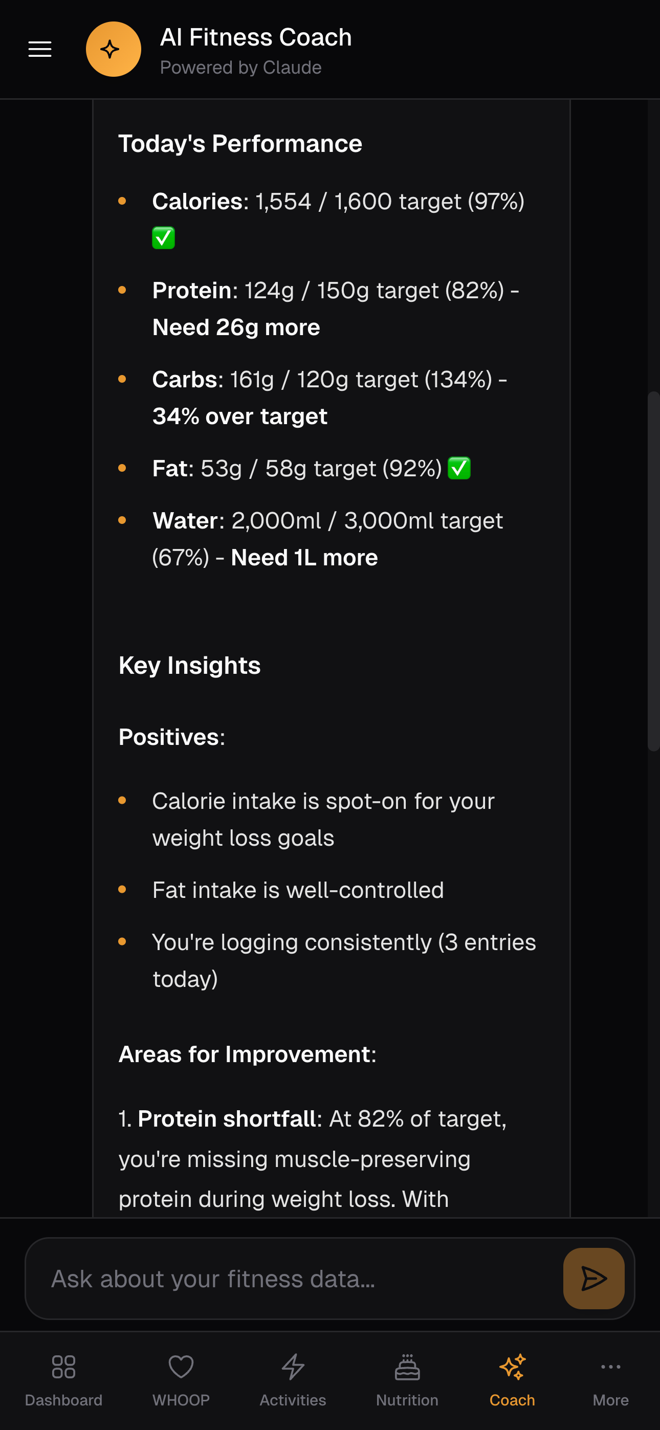 On fuelling, it looked at my actual nutrition logs and got specific:
